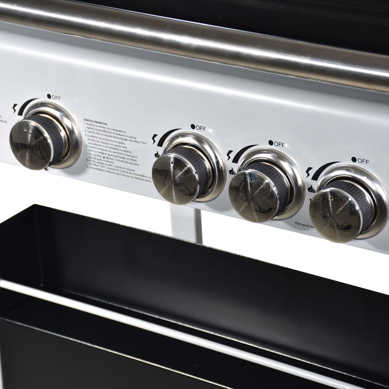 - Με 3 καυστήρες από ανοξείδωτο χάλυβα (inox) 3kW ο καθένας και 1 πλαϊνή εστία 2,5kW