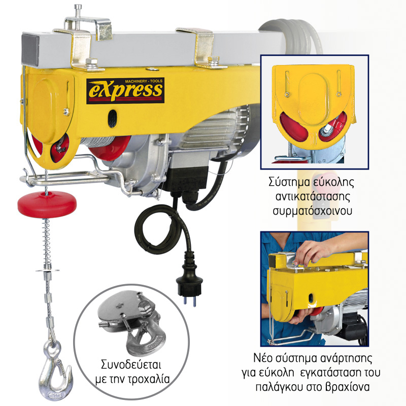 Ηλεκτρικό Παλάγκο Συρματόσχοινου 500W, Ικανότητας 125/250 kg – 12/6 m, Με Τερματικούς Διακόπτες Ανόδου – Καθόδου, Σύστημα Εύκολης Αντικατάστασης Συρματόσχοινου & Νέο Σύστημα για Εύκολη Ανάρτηση σε Βραχίονα