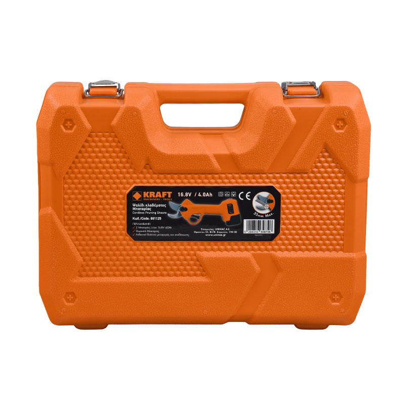 Βαρέως Τύπου Ψαλίδι Κλαδέματος Μπαταρίας με μέγιστη διάμετρο κοπής 35mm, επιλογή Προοδευτικής Κοπής, Προστασια Δακτύλων, ισχυρό επαγωγικό (brushless) μοτέρ 16.8 Volt, 2 Μπαταρίες 4,0Ah και φορτιστή ταυτόχρονης φόρτισης 2 μπαταριών.